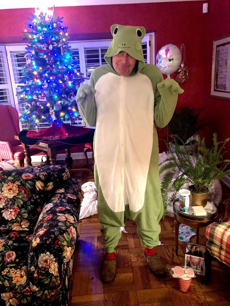 While I keep frog gifts from my granddaughters on the shelves of my office (and secretly position a few in our living room and den), most sadly remain in boxes. Even so, the frogs just keep coming. This last Christmas Eve, we celebrated with Lauren and her family. My granddaughters were most eager for me to open my Christmas present. AND put it on. Ever the obliging grandfather, I did (see below). I now wear my frog costume when we visit them – or when I go to Fresh Market to pick up dinner. . . .